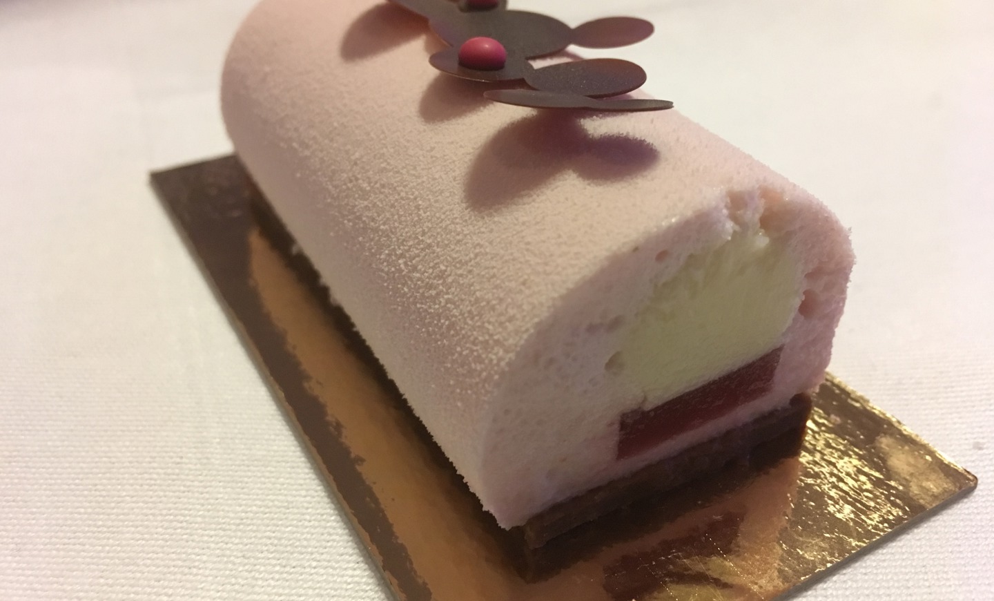 Hendes vinderkage består af en rabarbergele med kokoscreme og rabarberskum på en bund af ckololadeknas og lime.