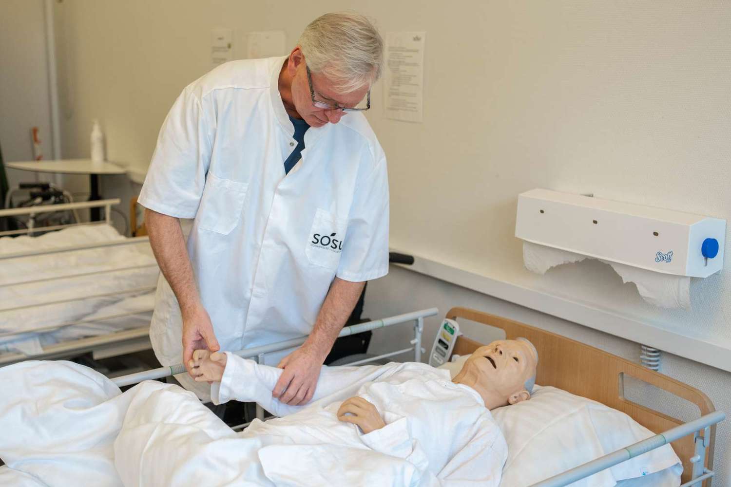 En stor del af undervisningen på social- og sunhedsuddannelsen handler om at blive god til at kommunikere med borgerne. Her øver John Kristensen med en dukke.