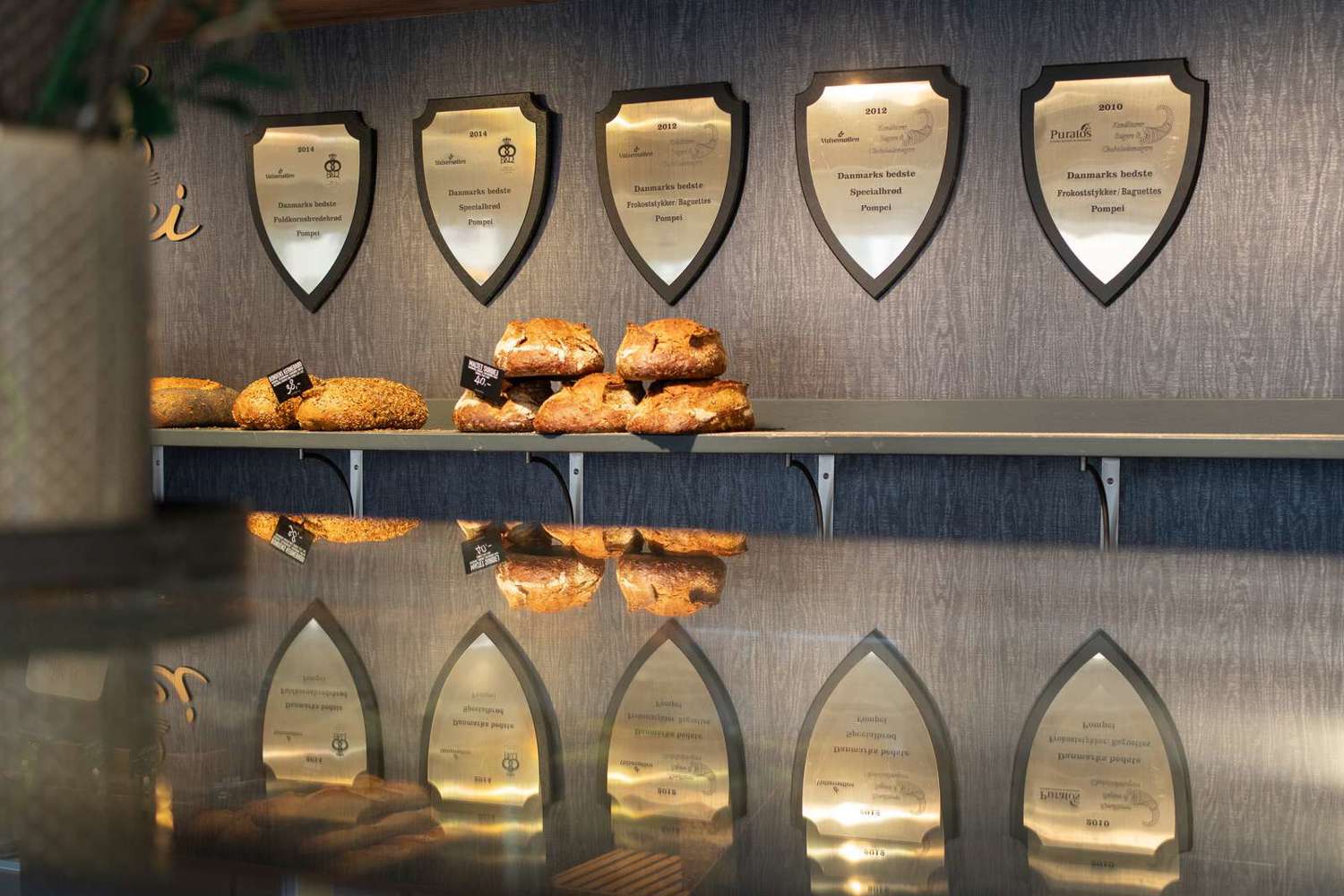 Her ses nogle af de præmier, der pryder væggene i bageriet Pompei.